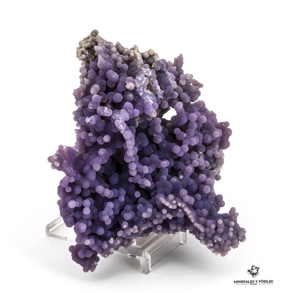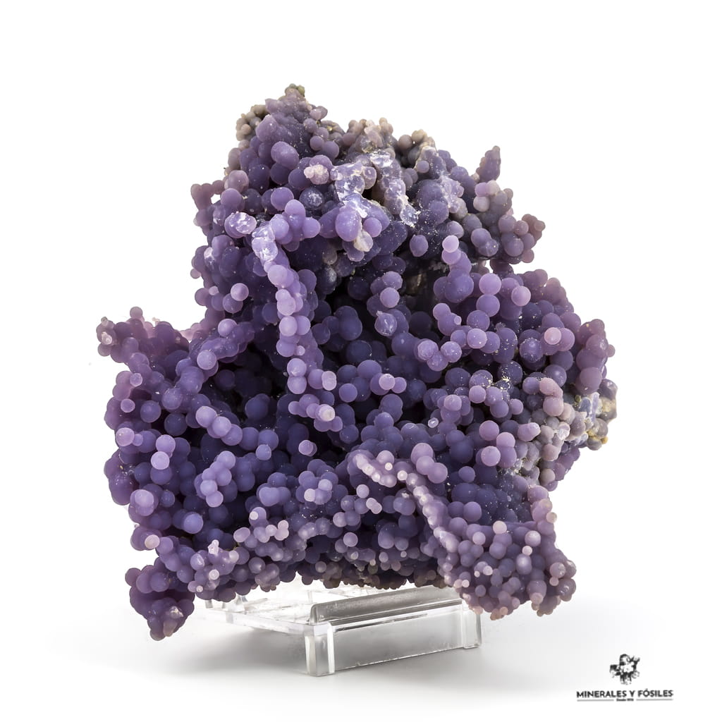 Calcedonia botrioidal en tono lavanda, con esferulitas grandes y bien definidas, de brillo ceroso y excelente relieve. Pieza muy estética y representativa de las formaciones botroidales de calidad.